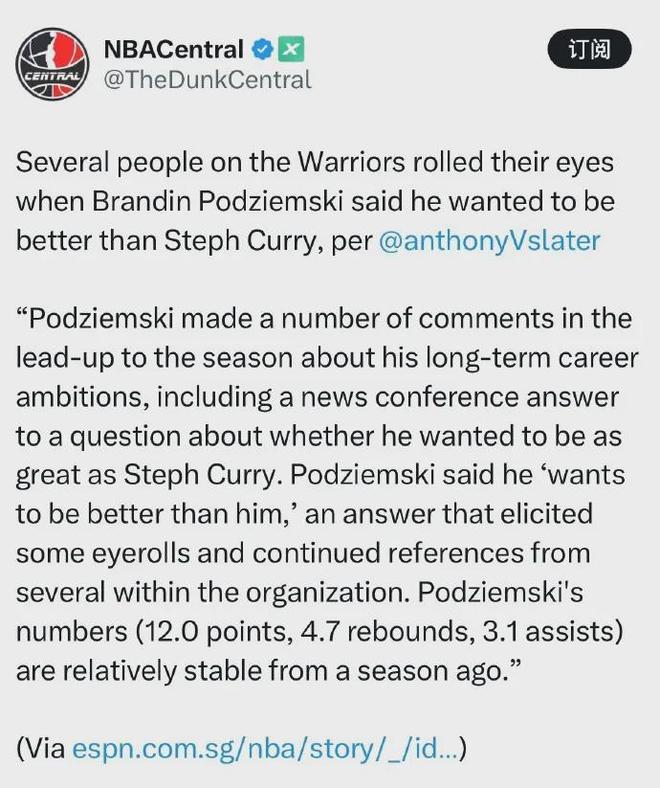 近日ESPN记者谈到了勇士的近况,透露波杰姆斯基在本赛季开始前的新闻发布会中,表示他不仅就想当接班人那么简单还要超越库里时,队内很多人对其言论翻起了白眼。